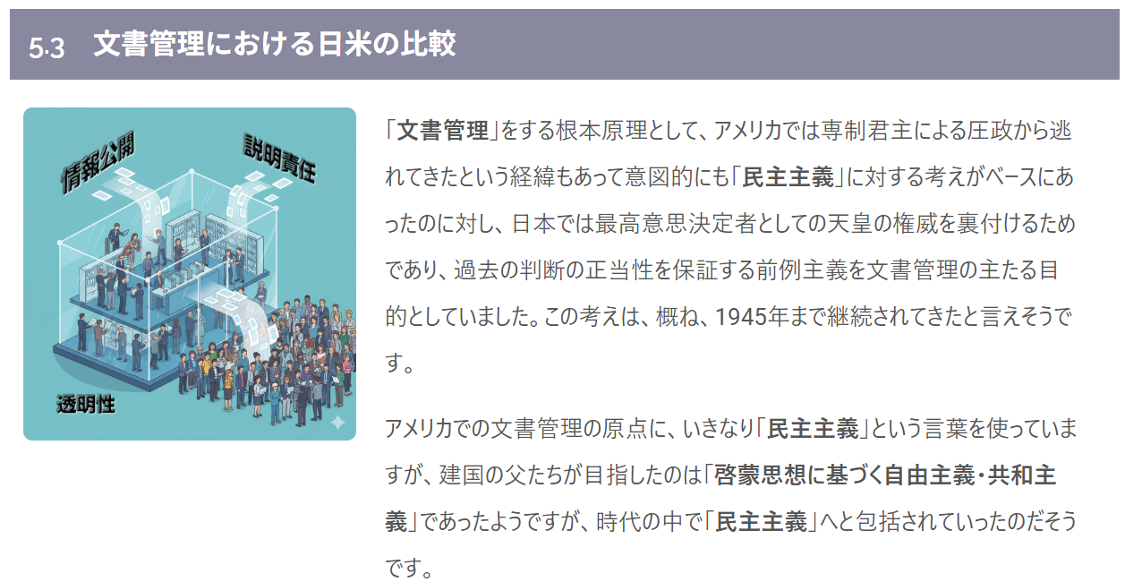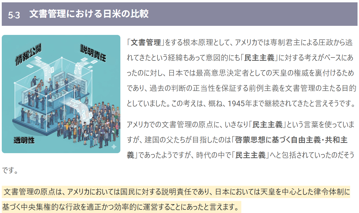 <p class="lead">「文書管理」をする根本原理として、アメリカでは専制君主による圧政から逃れてきたという経緯もあって意図的にも「民主主義」に対する考えがベースにあったのに対し、日本では最高意思決定者としての天皇の権威を裏付けるためであり、過去の判断の正当性を保証する前例主義を文書管理の主たる目的としていました。この考えは、概ね、1945年まで継続されてきたと言えそうです。</p>